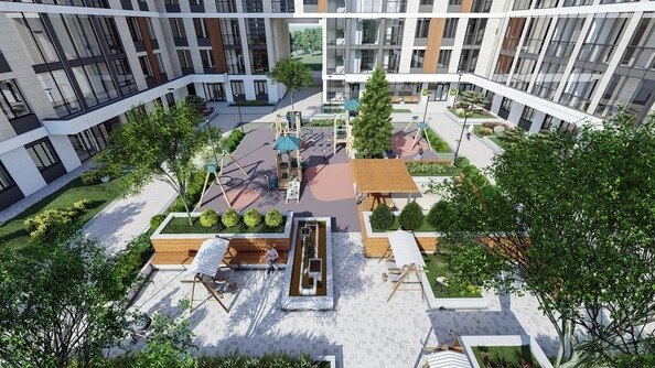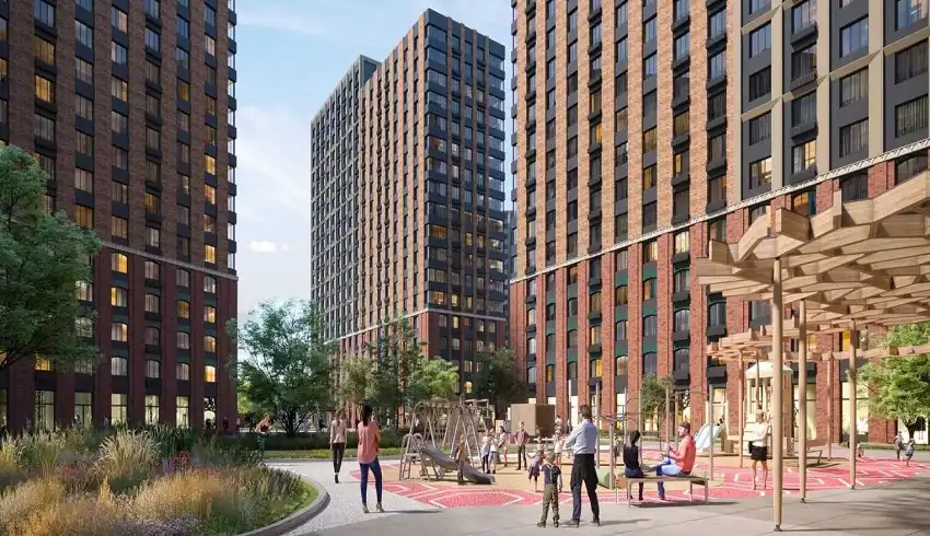 Восемь кирпично-монолитных корпусов спроектированы голландским бюро MLA+ и Genpro с вдохновением от исторической усадьбы: фасады из красного кирпича с белыми акцентами, три уникальных закрытых двора (1,5 га) без машин с игровыми, спортивными зонами и ландшафтным дизайном.