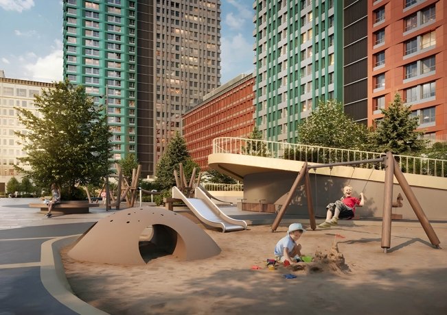 Площадки расположены на Зелёном бульваре и оборудованы навесами, смотровыми зонами для родителей и озеленением для тишины и создания комфортной тени.