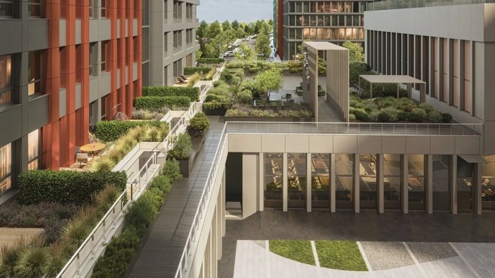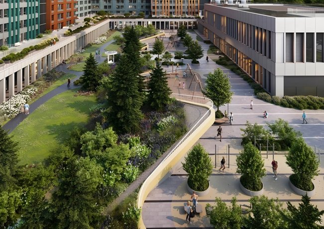 Зелёный бульвар, сердце квартала, длиной 800 метров, представляет собой пешеходную аллею с клумбами, скамейками и спортивными зонами, соединяет дома, школу, сад и ярус променада.