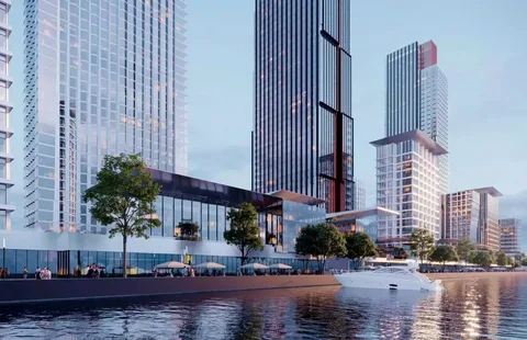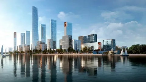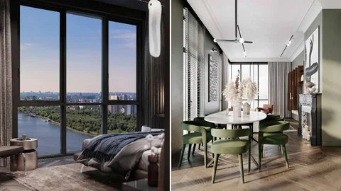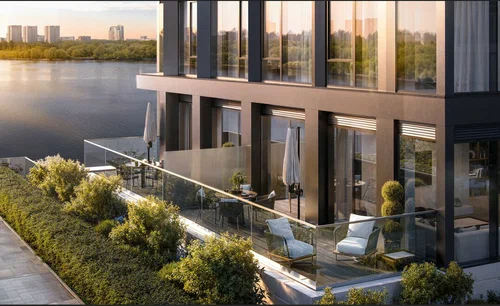Футуристический дизайн с зеркальными фасадами, отражающими воду и небо, с панорамными окнами от пола до потолка, пропускающими максимум света, и с потолками 3,15-4м, создающими ощущение простора и роскоши.